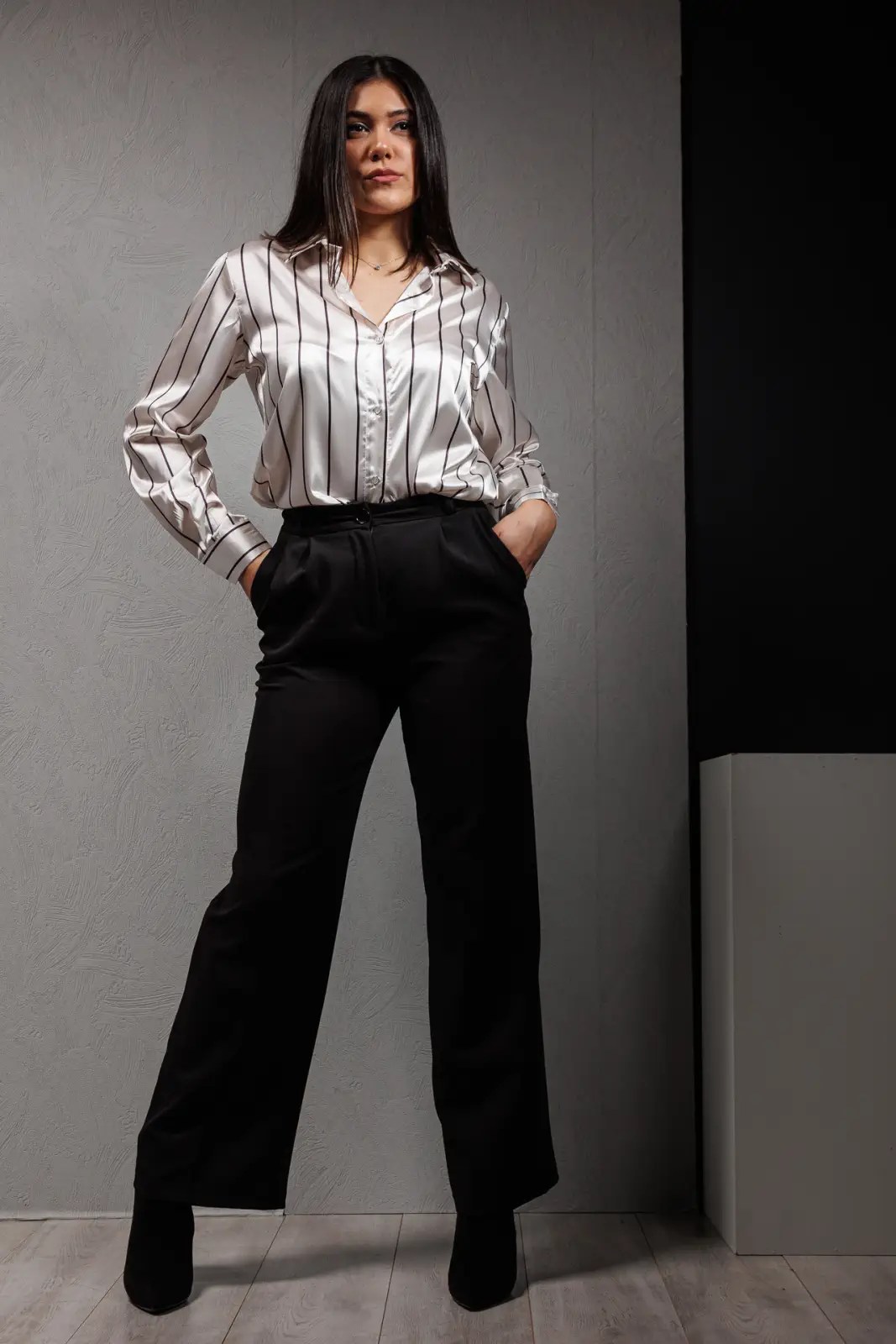 Σετ με γυναικείο σατέν πουκάμισο και υφασμάτινο παντελόνι φωτογράφιση σε διαμορφωμένο χώρο στο στούντιο με μελαχρινό μοντέλο