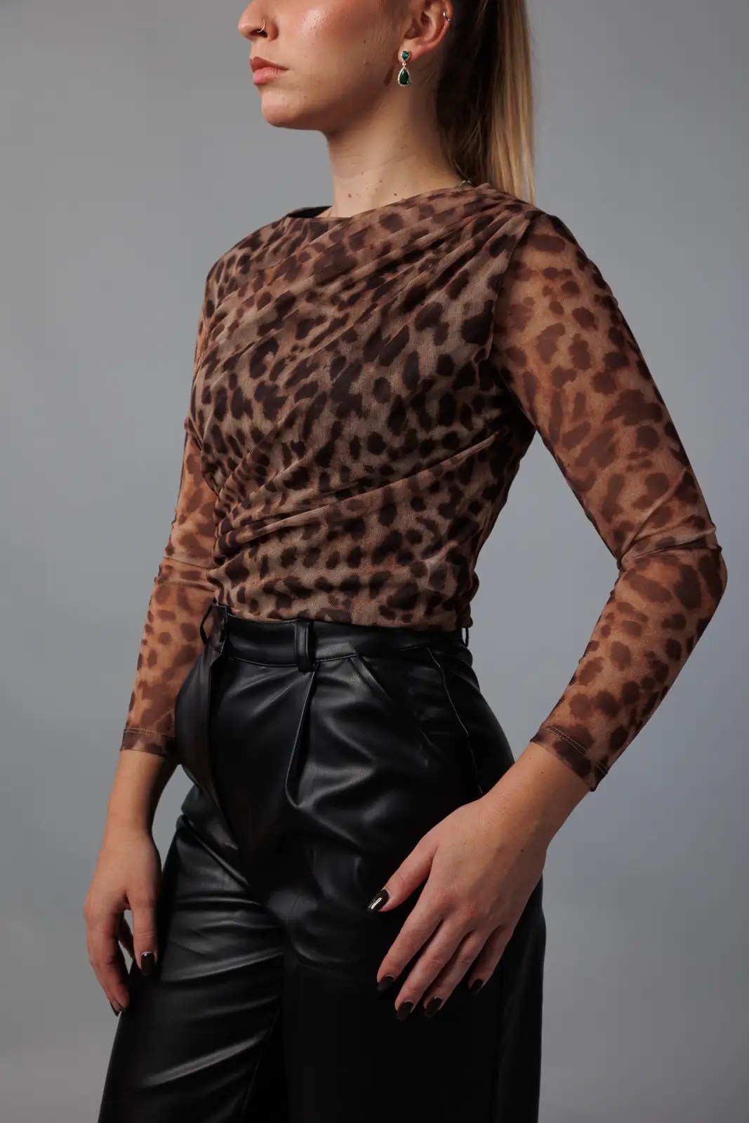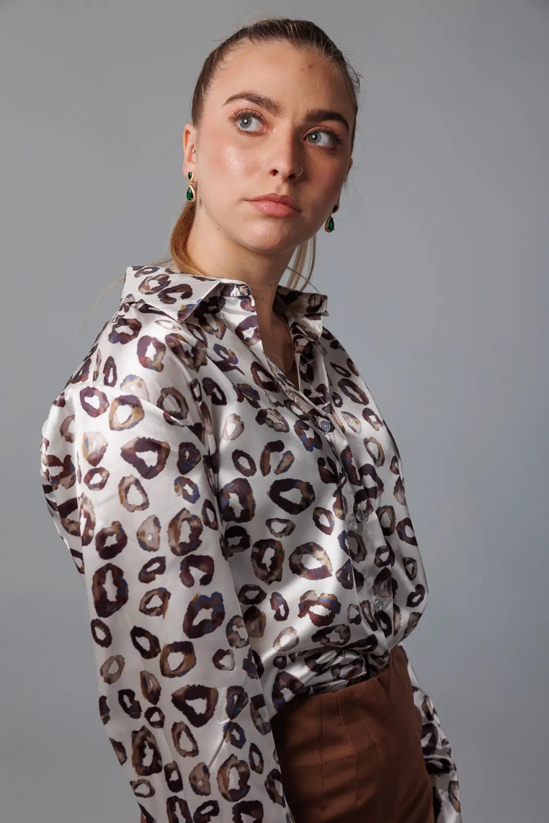 Φωτογράφιση σε στούντιο με γυναίκα μοντέλο παντελονι υφασματινο καφε και πουκαμισο σατεν animal print