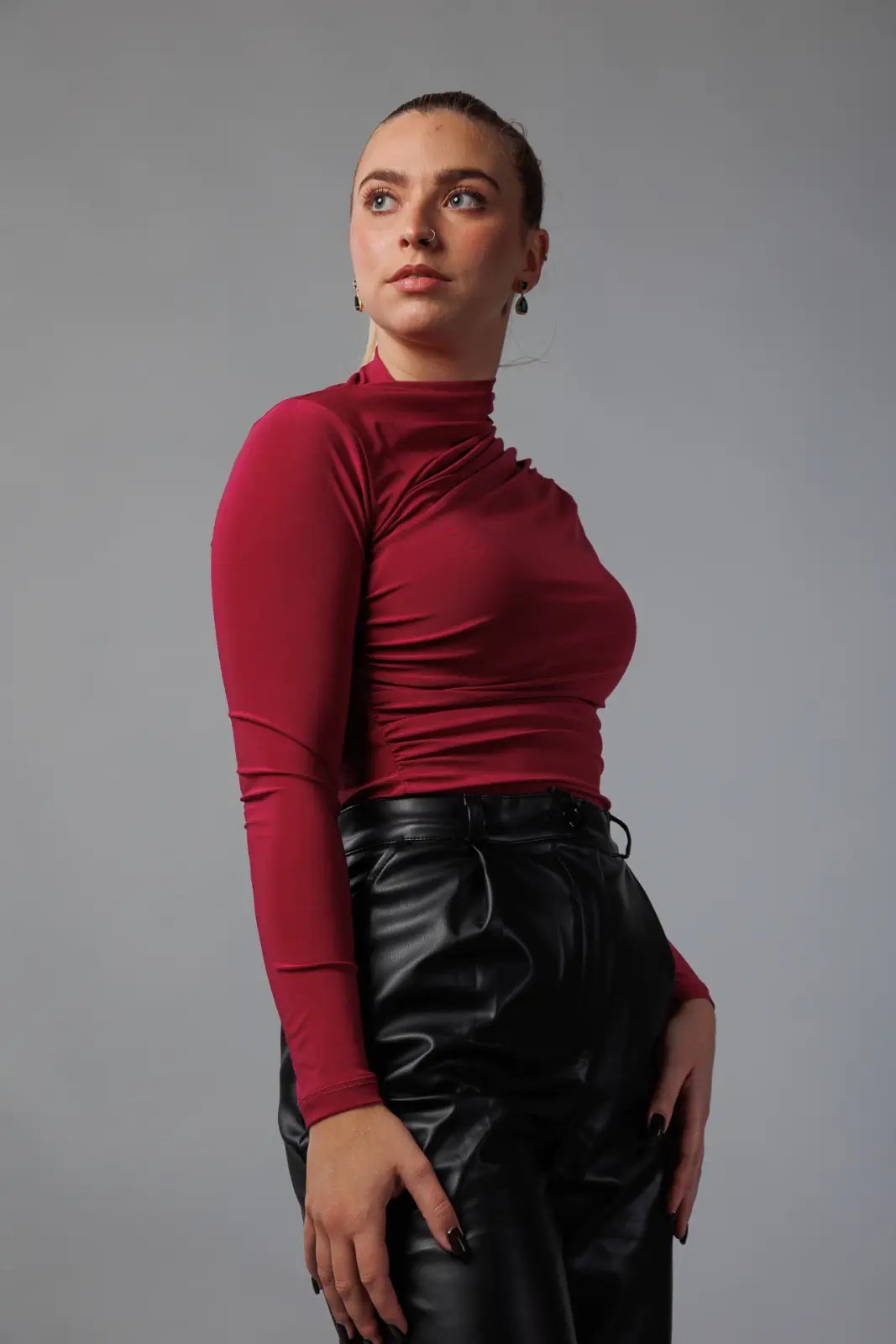 Μαύρο παντελόνι δερματίνη και κολλητό μπλουζάκι ζιβάγκο φορεμένα σε γυναικεία μοντέλο για τη φωτογράφιση γυναικείου ηλεκτρονικού καταστήματος